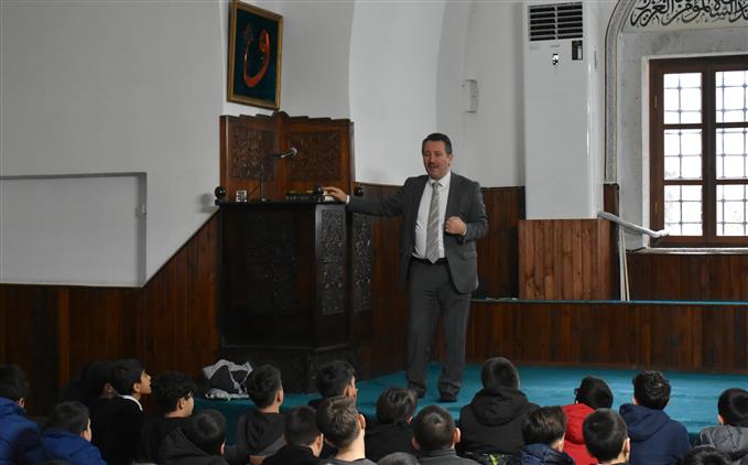Müftü Dilek, öğrencilere caminin bölümleri olan mihrap, minber ve kürsü hakkında bilgi vererek bu bölümlerin ne amaçla kullanıldığını anlattı. Ayrıca camide uyulması gereken adab ve ibadet esnasındaki dikkat edilmesi gereken hususlar hakkında da bilgilendirme yaptı.